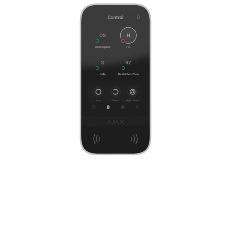 KeyPad TouchScreen наследует интерфейс приложений для смартфонов Ajax, обеспечивает простую и знакомую систему контроля. 5-дюймовый сенсорный экран позволяет быстро получить доступ к текущему режиму безопасности любой группы. Он активируется при подъеме руки и имеет автоматическую регулировку яркости. Клавиатура имеет звуковую индикацию и может извещать о тревогах, задержки при входе/выходе, открытие двери, когда система снимает с охраны. Громкость регулируется в приложении Ajax. На клавиатуре отображается результат проверки целостности системы и сообщений о неполадках при постановке на охрану.
